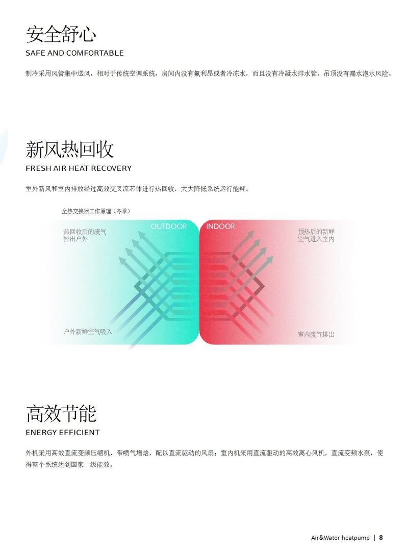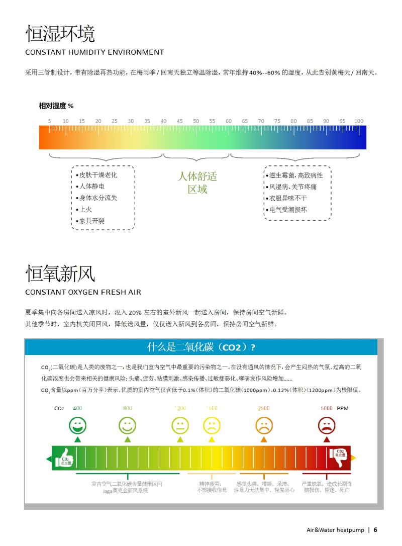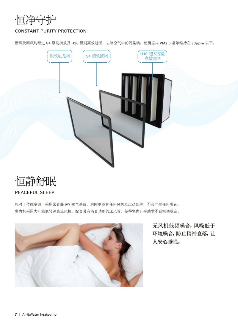 四季恒溫 CONSTANT TEMPERATURE IN ALL SEASONS 秉承雅凱的一貫高性能設(shè)計,常春藤采用直流變頻驅(qū)動技術(shù),配上EVI 噴氣增焓壓縮技術(shù),使得機組擁有卓越的性能,哪怕在 -30℃ 或者 +51℃ 的惡劣環(huán)境,也能全天候為你提供恒溫環(huán)境,常年維持在22-26℃之間。 夏季機組集中送涼風(fēng)進入各個房間,以保持房間涼爽;冬季采用地暖加熱房間,舒適健康。 恒濕環(huán)境 CONSTANT HUMIDITY ENVIRONMENT 采用三管制設(shè)計,帶有除濕再熱功能,在梅雨季 / 回南天獨立等溫除濕,常年維持 40%-60% 的濕度,從此告別黃梅天 / 回南天。 恒氧新風(fēng) CONSTANT OXYGEN FRESH AIR 夏季集中向各房間送入涼風(fēng)時,混入 20% 左右的室外新風(fēng)一起送入房間,保持房間空氣新鮮。 其他季節(jié)時,室內(nèi)機關(guān)閉回風(fēng),降低送風(fēng)量,僅僅送入新風(fēng)到各房間,保持房間空氣新鮮。 恒靜舒眠 PEACEFUL SLEEP 相對于傳統(tǒng)空調(diào),采用常春藤 IVY 空氣系統(tǒng),房間里沒有任何風(fēng)機及運動部件,不會產(chǎn)生任何噪音。 室內(nèi)機采用大葉輪低轉(zhuǎn)速直流風(fēng)機,配合帶有消音功能的送風(fēng)管,使得室內(nèi)幾乎感覺不到空調(diào)噪音。 恒凈守護 CONSTANT PURITY PROTECTION 新風(fēng)及回風(fēng)均經(jīng)過 G4 級別初效及 H11 級別高效過濾,去除空氣中的污染物,使得室內(nèi) PM2.5 常年維持在 30ppm 以下。 新風(fēng)熱回收 FRESH AIR HEAT RECOVERY 室外新風(fēng)和室內(nèi)排放經(jīng)過高效交叉流芯體進行熱回收,大大降低系統(tǒng)運行能耗。