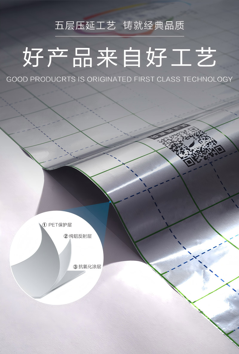 綠羽純鋁鉑晶膜由高強度PET膜和抗氧化涂層復合而成,鋁層厚度達7μm,可有效隔絕氧氣和水份,具有均熱、防水、防止混凝土侵蝕保溫板的作用。鉑晶膜上的網(wǎng)格為施工人員設計盤管路線、確定地暖管間距提供便利和依據(jù),讓地暖管盤管過程更加標準化。